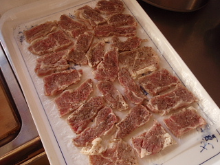 | 1 | 肉を繊維にそって5〜6mm程度の厚さにスライスし、各々の漬け液につけ、冷蔵庫へ。漬けるときはまとめて入れずに1枚ずつ入れ液になじむようにします。 |