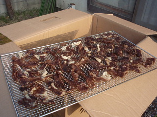 | 3 | 乾燥。水分を拭き取り1種類の方は肉が薄かったので屋外にて日陰干し乾燥。 少し厚い方の肉は脱水シートに包み冷蔵庫へ。 |