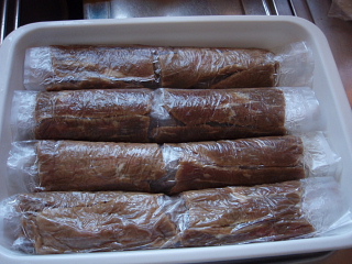 | 5 | 約12時間後、ピチットを交換し再び冷蔵庫へ。本来ならピチットで脱水後日なた及び日陰乾燥したいのですが、運悪く只今軒下工事で大工とか他業者が入っているので出来ません。 夜、工事が終わったのでピチットから出しベランダで外気干し。 |