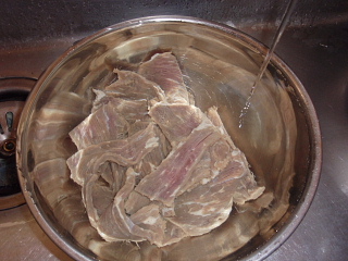 | 2 | 翌日、肉に付いた漬け液を洗い流し流水にて塩抜き。2時間の流水。 |
