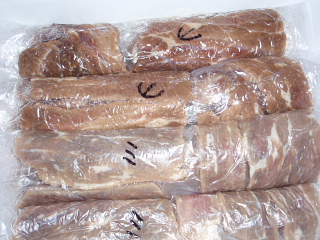 | 6 | 朝、スモコ2号に入れ燻煙開始。サクラスモークウッド1本使用。熱源は電熱器で60℃ 燻煙から2時間後電熱器を消し、ウッドのみで燻煙。40℃(冷温燻?)ほぼ4時間。 |