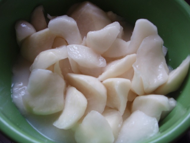1.大根を私の場合はなた漬風にちょいと大きめの乱切り。