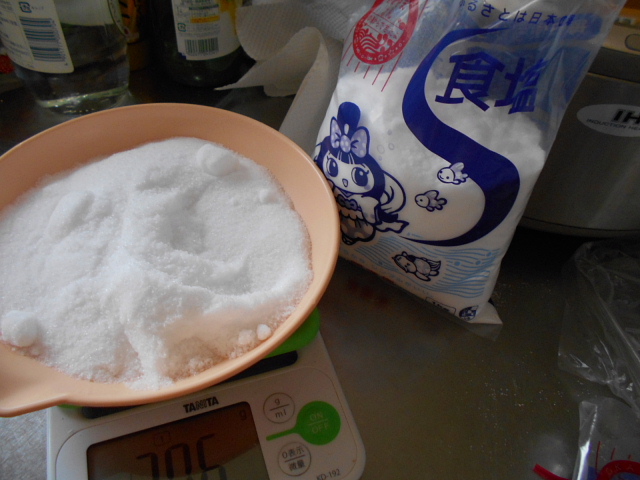 塩は3%の濃度で漬けます。今回は量が多いのでアイスボックスで漬けて見ました。