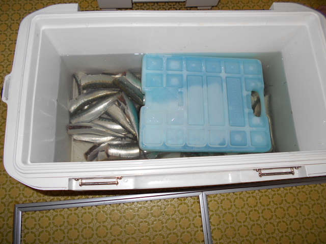 イワシを入れるとこんな感じ。入れ終わったら上に保冷剤を入れフタをして